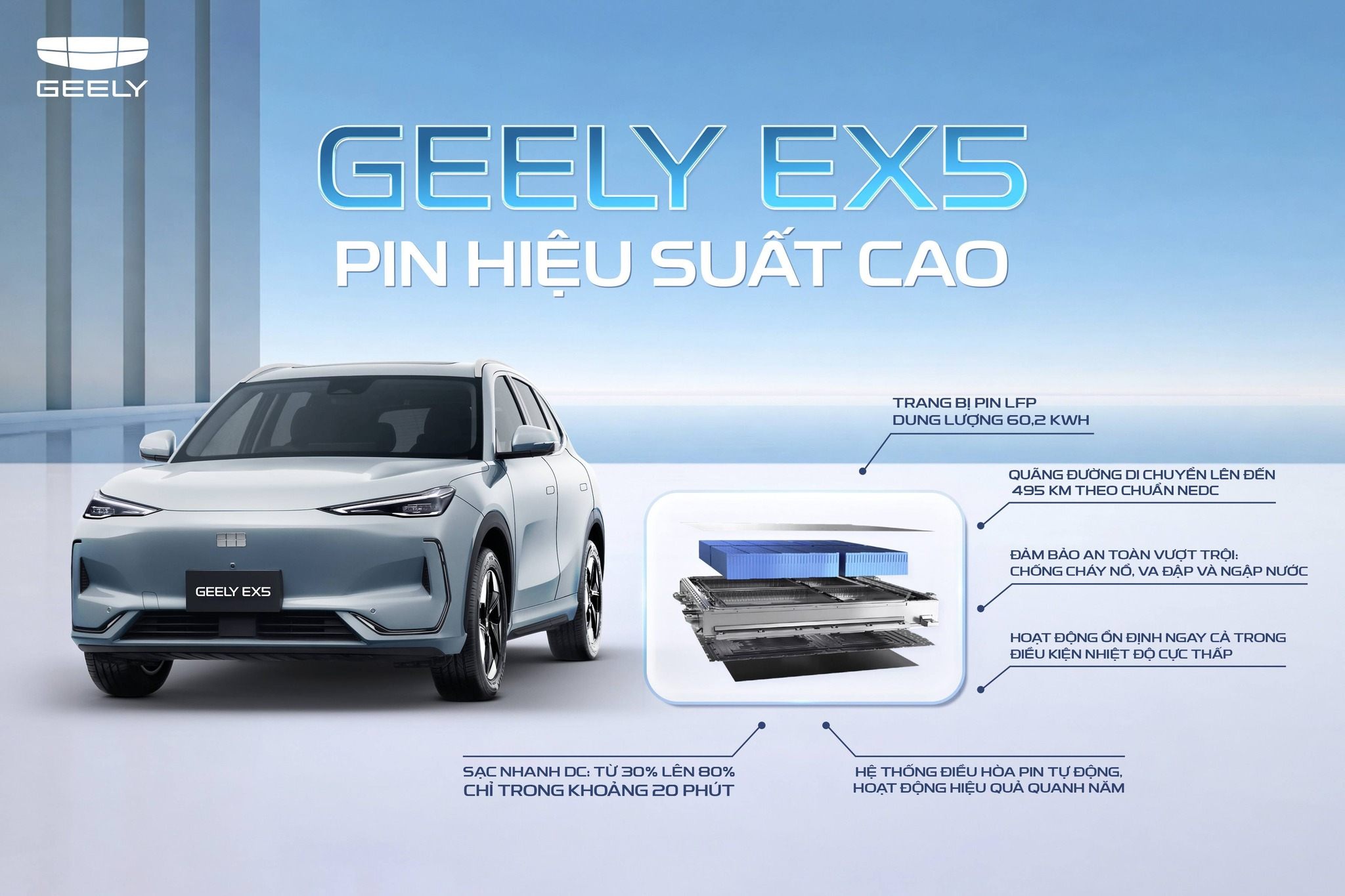 Đáng chú ý, trước những lo ngại về an toàn pin xe điện, Geely EX5 sử dụng công nghệ pin độc quyền Galaxy với 8 lớp bảo vệ toàn diện, kết hợp giữa thiết kế cơ khí, điều khiển thông minh và công nghệ đám mây, giúp ngăn ngừa cháy nổ và loại bỏ điểm mù trong an toàn pin.